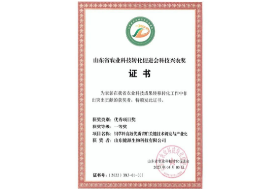 2023年5月27日, 第三屆全省科技興農(nóng)獎表彰獎勵大會在青島成功舉行,會上對在2022年度全省農(nóng)業(yè)科技成果轉化工作中涌現(xiàn)的先進集體、先進個人和優(yōu)秀項目進行表彰,山東健源生物科技有限公司《飼草料高效優(yōu)質(zhì)青貯關鍵技術研發(fā)與產(chǎn)業(yè)化》項目榮獲山東省農(nóng)業(yè)科技轉化促進會科技興農(nóng)獎優(yōu)秀項目獎一等獎。