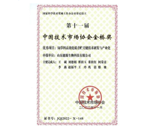 近日, “構(gòu)建新發(fā)展格局,建設(shè)中國式現(xiàn)代化高層報(bào)告會(huì)暨第十一屆中國技術(shù)市場協(xié)會(huì)金橋獎(jiǎng)表彰獎(jiǎng)勵(lì)大會(huì)”在北京隆重召開,經(jīng)專家評審委員會(huì)評審,山東健源生物科技有限公司《飼草料高效優(yōu)質(zhì)青貯關(guān)鍵技術(shù)研發(fā)與產(chǎn)業(yè)化》項(xiàng)目榮獲第十一屆中國技術(shù)市場協(xié)會(huì)金橋獎(jiǎng)優(yōu)秀項(xiàng)目獎(jiǎng)。