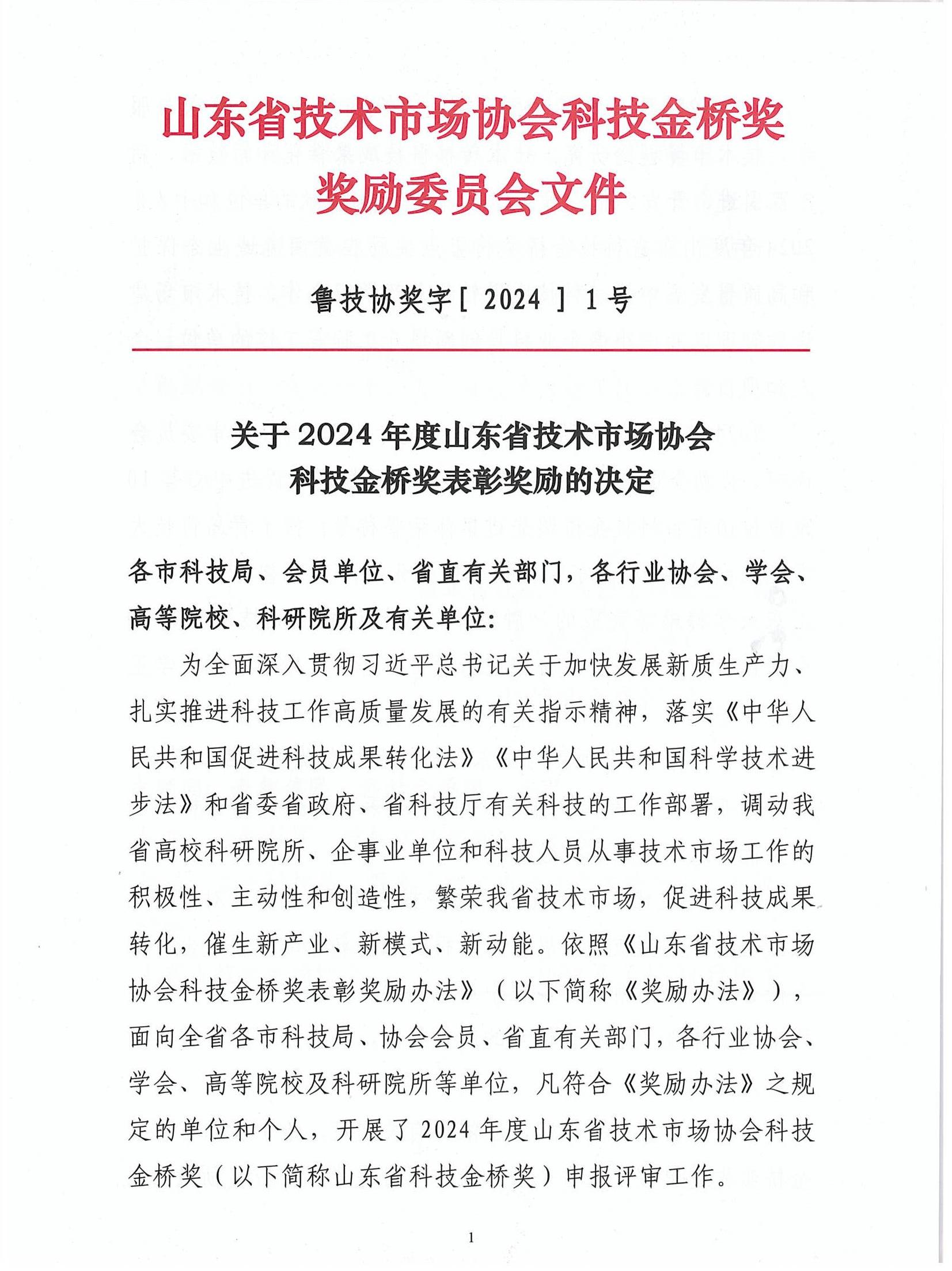 山東省技術(shù)市場協(xié)會科技金橋獎