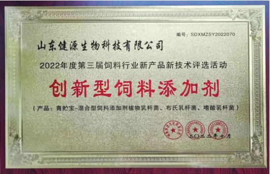 祝賀山東健源生物(青貯寶)產(chǎn)品榮獲“2022年度創(chuàng)新型飼料添加劑”榮譽(yù)稱號(hào)