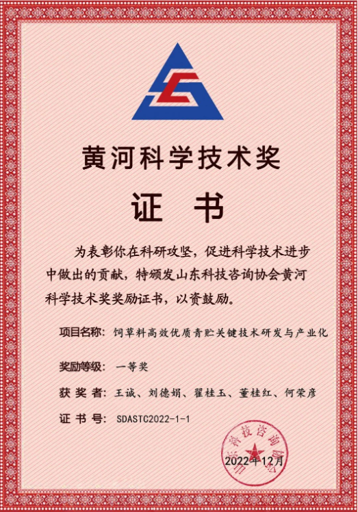 2022年12月山東科技咨詢協(xié)會公布了2022年黃河科學技術獎評審結果的公告,經專家評審會評審,現(xiàn)批準28個項目獲2022年山東科技咨詢協(xié)會黃河科學技術獎,其中一等獎3人,二等獎5人,三等獎20人。山東健源生物科技有限公司申報的《飼草料高效優(yōu)質青貯關鍵技術研發(fā)與產業(yè)化》項目榮獲一等獎。