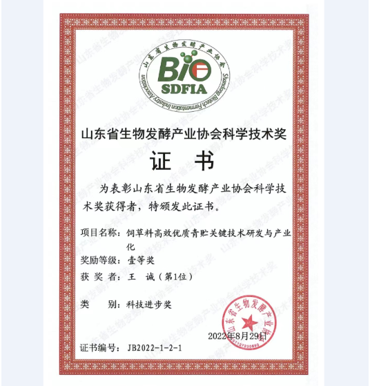 根據(jù)《國務(wù)院辦公廳關(guān)于完善科技成果評價機制的指導(dǎo)意見》(國辦發(fā)(2021)26 號)和《山東省科技廳關(guān)于進一步鼓勵和規(guī)范山東省社會力量獎設(shè)立科學(xué)技術(shù)獎的指導(dǎo)意見》(魯科字[2018]129號)精神,按照《山東省生物發(fā)酵產(chǎn)業(yè)協(xié)會科學(xué)技術(shù)獎獎勵章程》相關(guān)規(guī)定,開展了 2022 年度山東省生物發(fā)酵產(chǎn)業(yè)協(xié)會科學(xué)技術(shù)獎的申報、評審工作,經(jīng)山東省生物發(fā)酵產(chǎn)業(yè)協(xié)會科學(xué)技術(shù)獎勵委員會評審和審核,山東省生物發(fā)酵產(chǎn)業(yè)協(xié)會批準,授予2項成果為科技進步獎一等獎,4項成果為科技進步獎二等獎,5項成果為科技進步獎三等獎。山東健源生物科技有限公司《飼草料高效優(yōu)質(zhì)青貯關(guān)鍵技術(shù)研發(fā)與產(chǎn)業(yè)化》項目榮獲山東省生物發(fā)酵產(chǎn)業(yè)協(xié)會科學(xué)技術(shù)獎科技進步獎一等獎。
